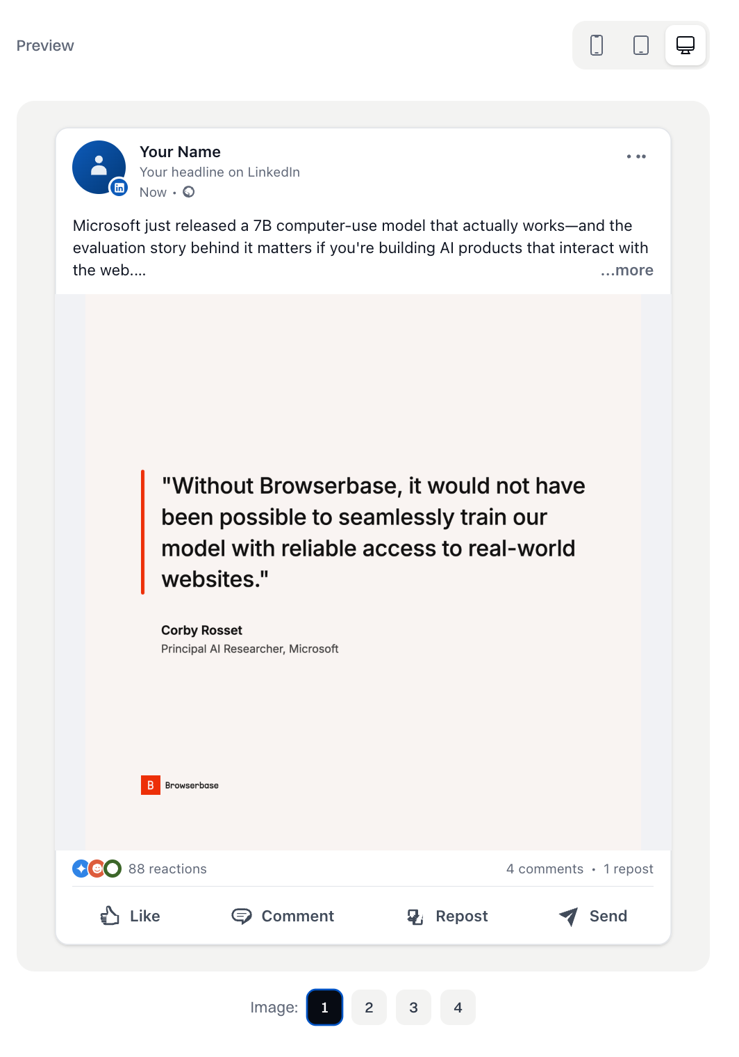 I had been testing the new LinkedIn carousels feature with Browserbase's website when I realized, why don't I just show that? So, I brought a whole bunch of code from the app over to the marketing site and piped the actual product experience with their actual generated posts into the landing page.